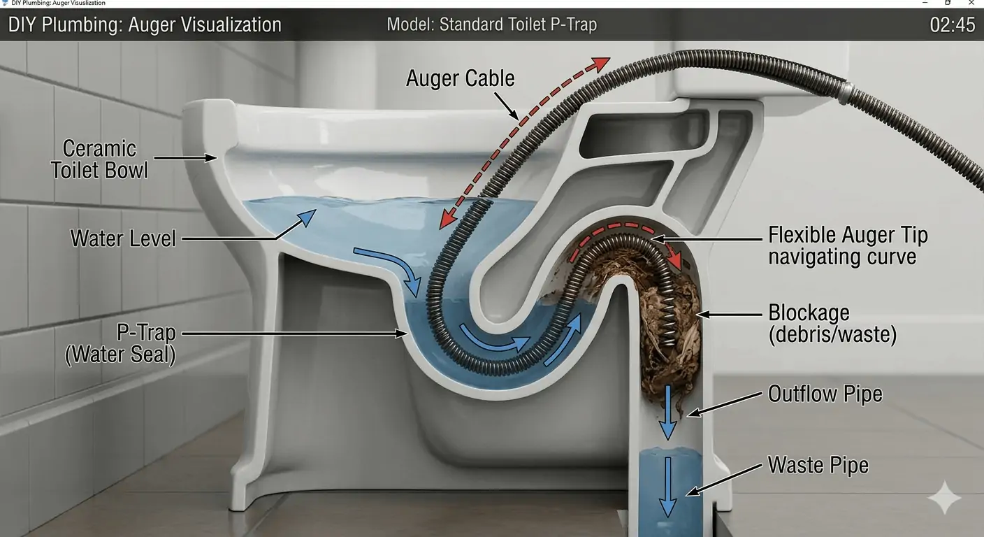 When the plunger fails, we move to the "closet auger." This is a flexible steel cable inside a protective metal tube designed to navigate the toilet's internal curves without scratching the porcelain [4].