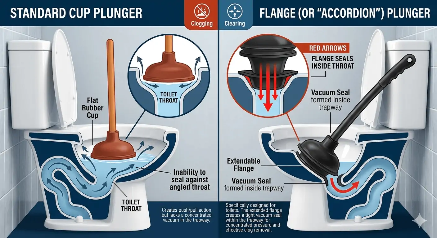 Most homeowners own the wrong tool. Those red, cup-shaped plungers are designed for flat sinks. For a toilet, you must use a flange plunger—it has an extra rubber sleeve tucked inside the bottom specifically to fit the toilet's throat.
