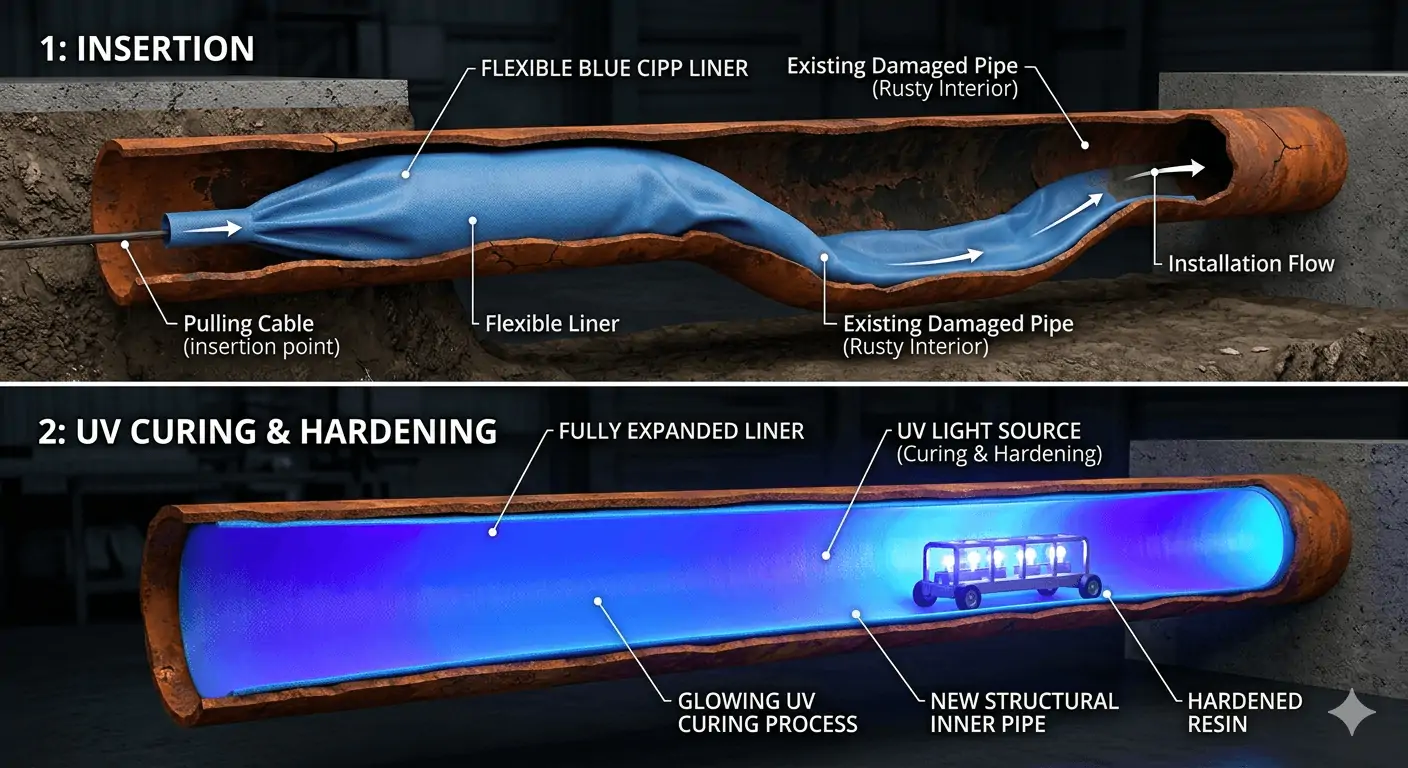 This is the gold standard for residential repair. We pull a flexible, resin-soaked liner into the old pipe, inflate it, and "cure" (harden) it using heat or UV light. Once it sets, you have a seamless, structural pipe inside the old one. We follow strict industry standards like ASTM F1216 to ensure the new pipe is strong enough to last for decades [5, 6].