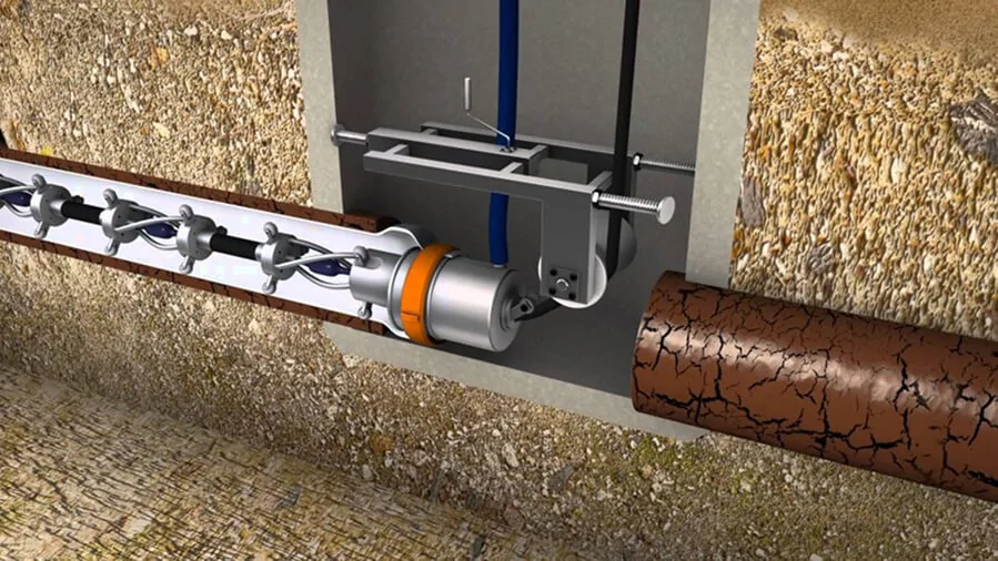 Pipe Bursting. A conical bursting head is pulled through the old pipe, shattering it while simultaneously pulling a new high-density polyethylene (HDPE) pipe into its place .